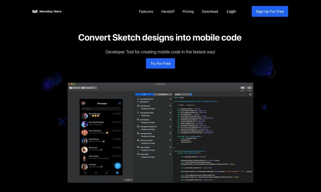 Monday Hero converts design into mobile code. Developers can get layout code with design specs - colors, fonts and assets - as a bundle.