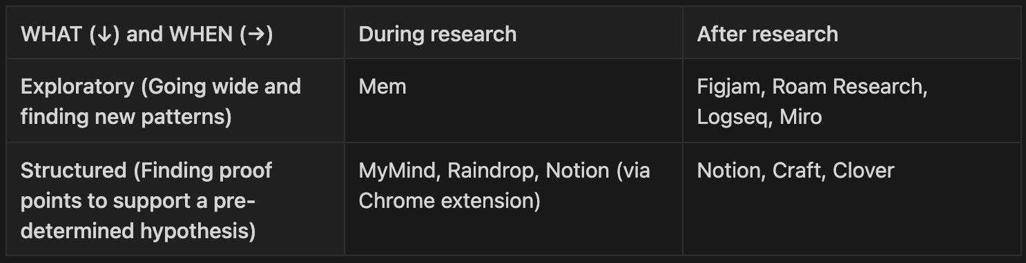Figjam is a top pick for white-boarding exploratory research and finding new patterns and insights. Other apps like Mem and Roam Research are also helpful in connecting the dots to find new insights (more textual and less visual) but they have a higher learning curve.