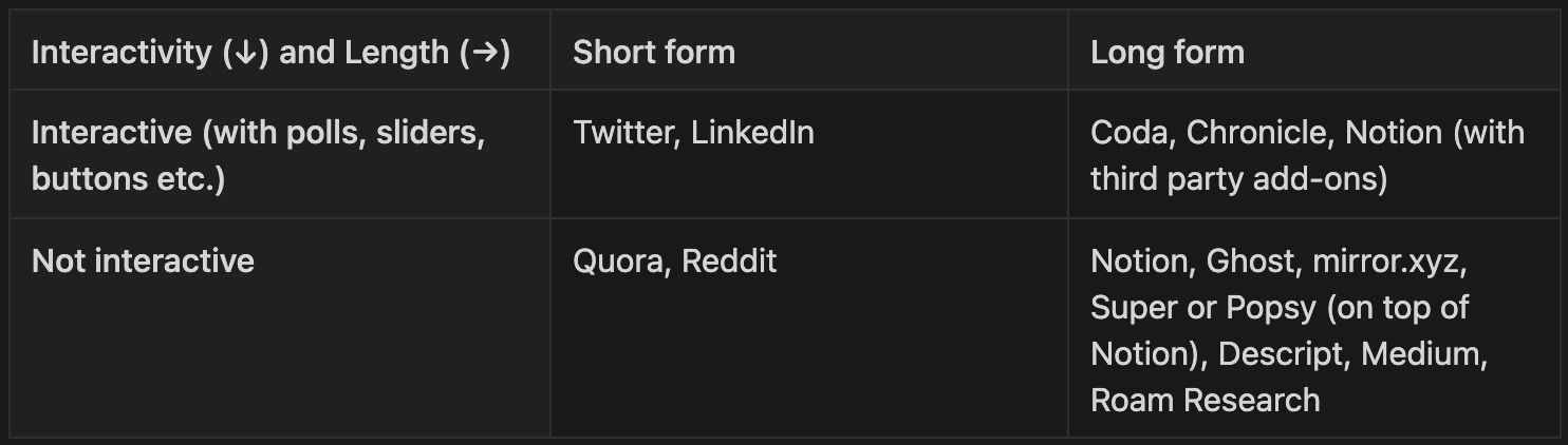 Our pick for sharing your knowledge with the world → Twitter (Short form) and Notion (with third-party add-ons; long form)