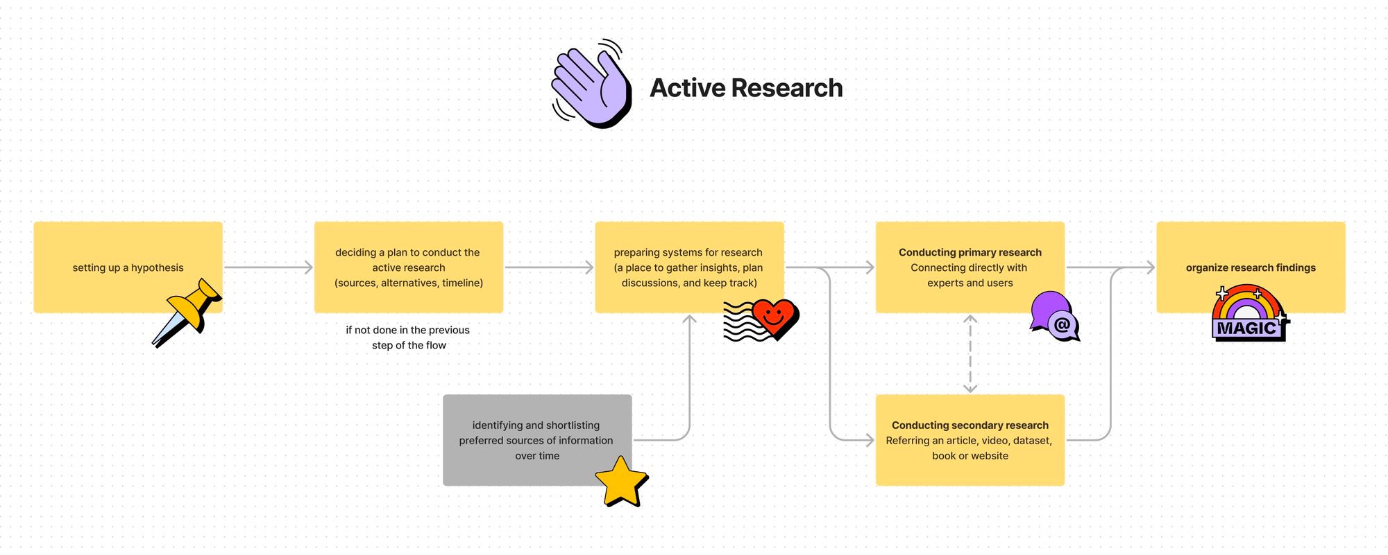 Compared to the process of passive search, in which we are not actively seeking information, conducting active research is the process of seeking out and evaluating information to answer a specific question or solve a problem. It's an essential skill for knowledge workers, who need to be able to find accurate, reliable information quickly and efficiently.