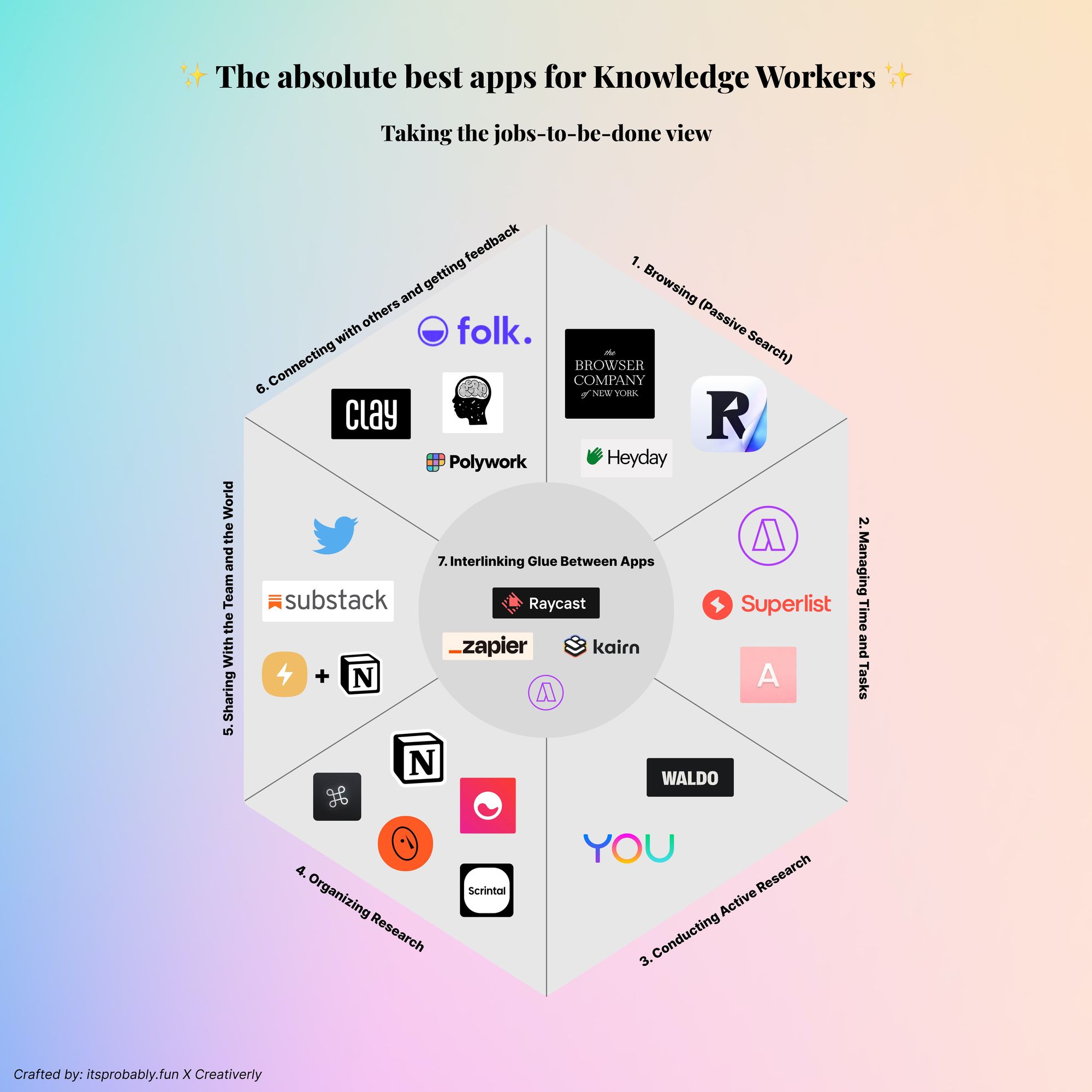 Philipp and I (Tejas - Probably Nothing) have been product geeks for a long time. And we often get asked out about our favourite apps. In this article, we will be breaking down the entire journey of a knowledge worker to understand the needs and the flow and recommend a handful of apps that you’d require in an average week.