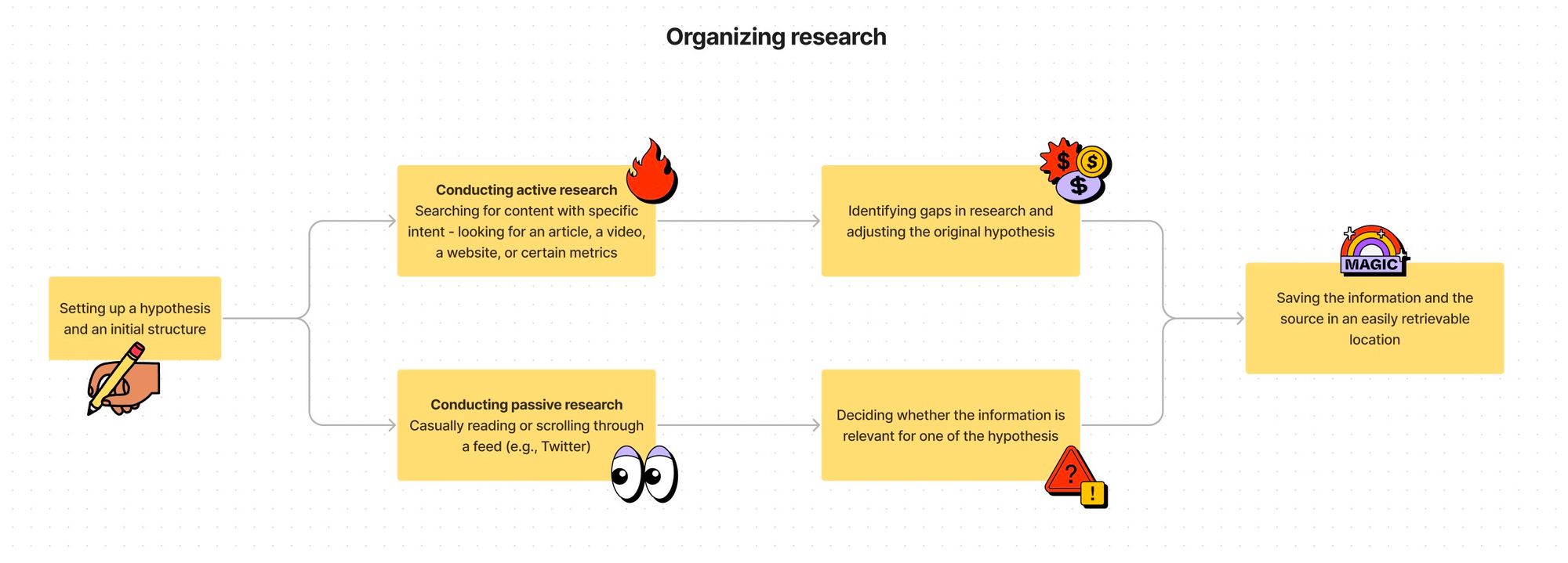 - 🏋️♂️ Too much effort: Users feel the effort that they have to put in organising information increases exponentially with the depth of research. Some feel that organising research is harder than the actual process of conducting research – they feel they might miss out on patterns/insights if they don’t devote enough time. A lot of time is also spent going through what they’d researched, too.
