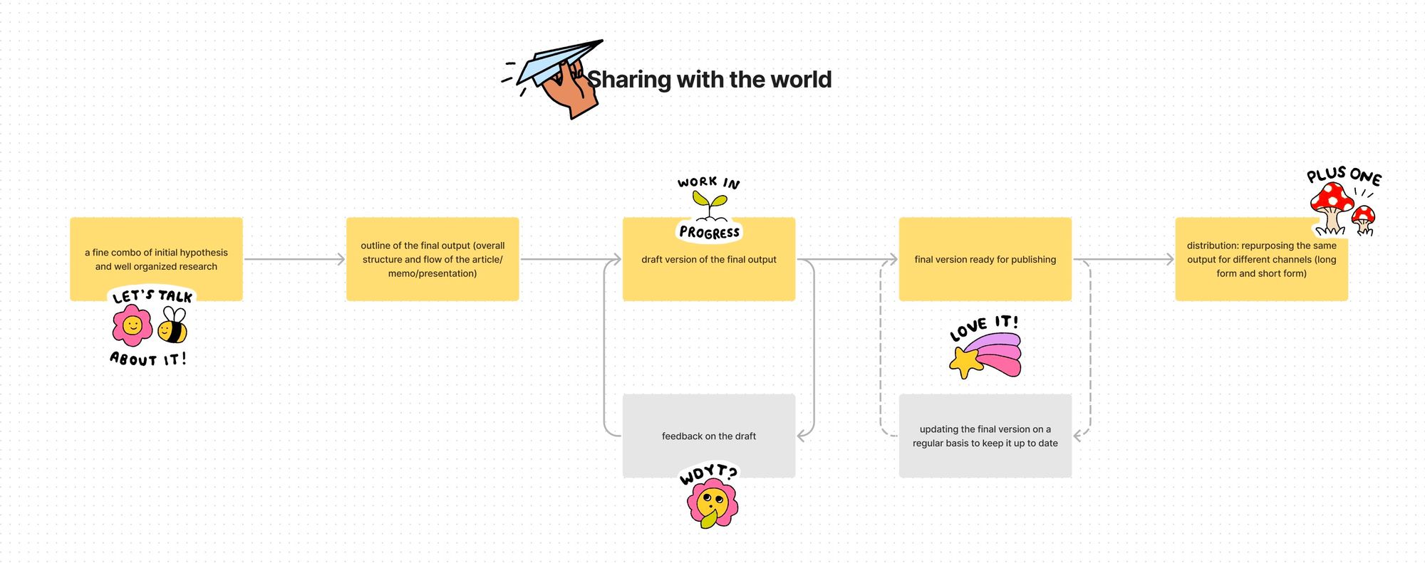 Organizing research is often followed by sharing the findings with a small set of people, or publicly with everyone on the internet. The typical flow for sharing your knowledge (often) involves converting the research repository into a reading-optimised format: