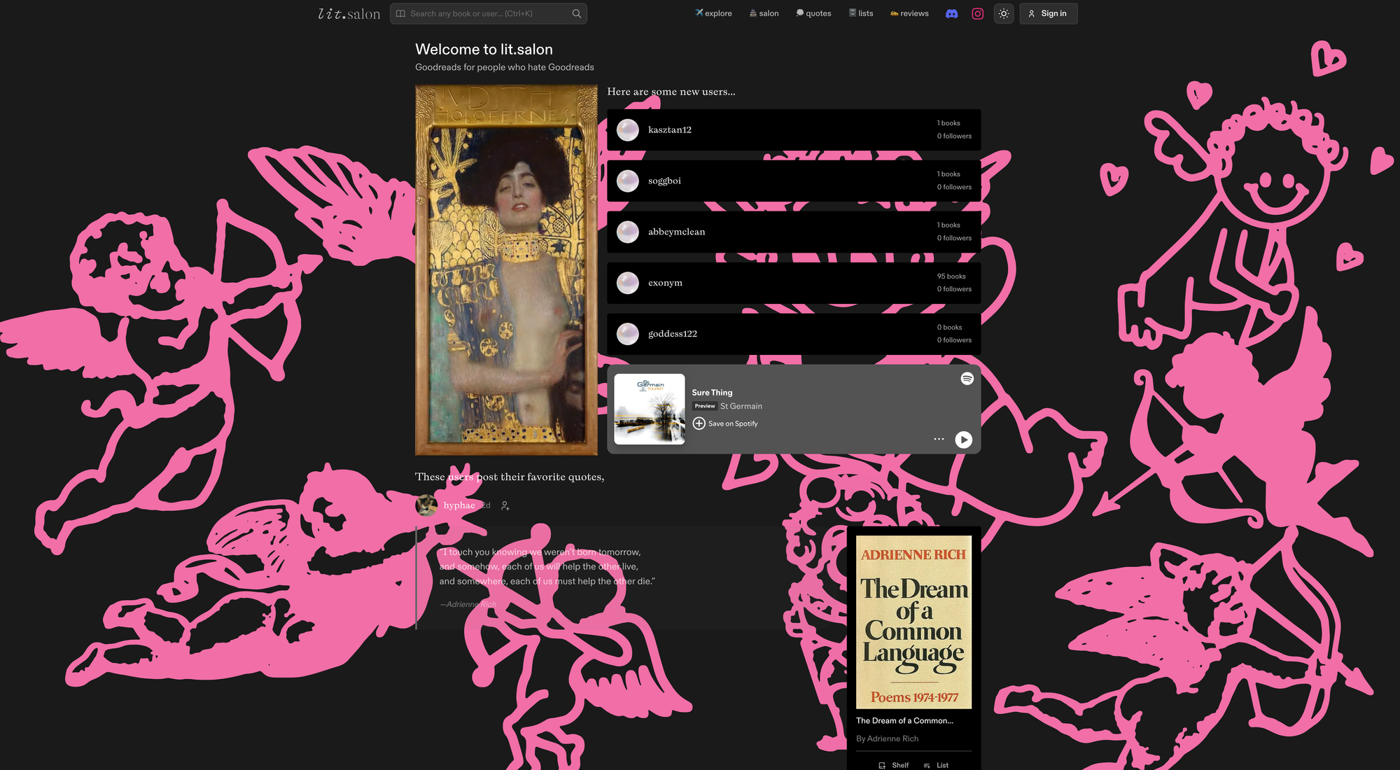 lit.salon entitles itself as Goodreads for people who hate Goodreads. I haven't used Goodreads in a while, so I wouldn't say I hate it, but since Amazon took over, it definitely became worse. What immediately struck my attention when it stumbled across lit.salon were it visuals and overall design. To be honest, at the first quick glance I had no idea what was going on on the homepage, but it definitely provided some fresh and artistic design vibes.