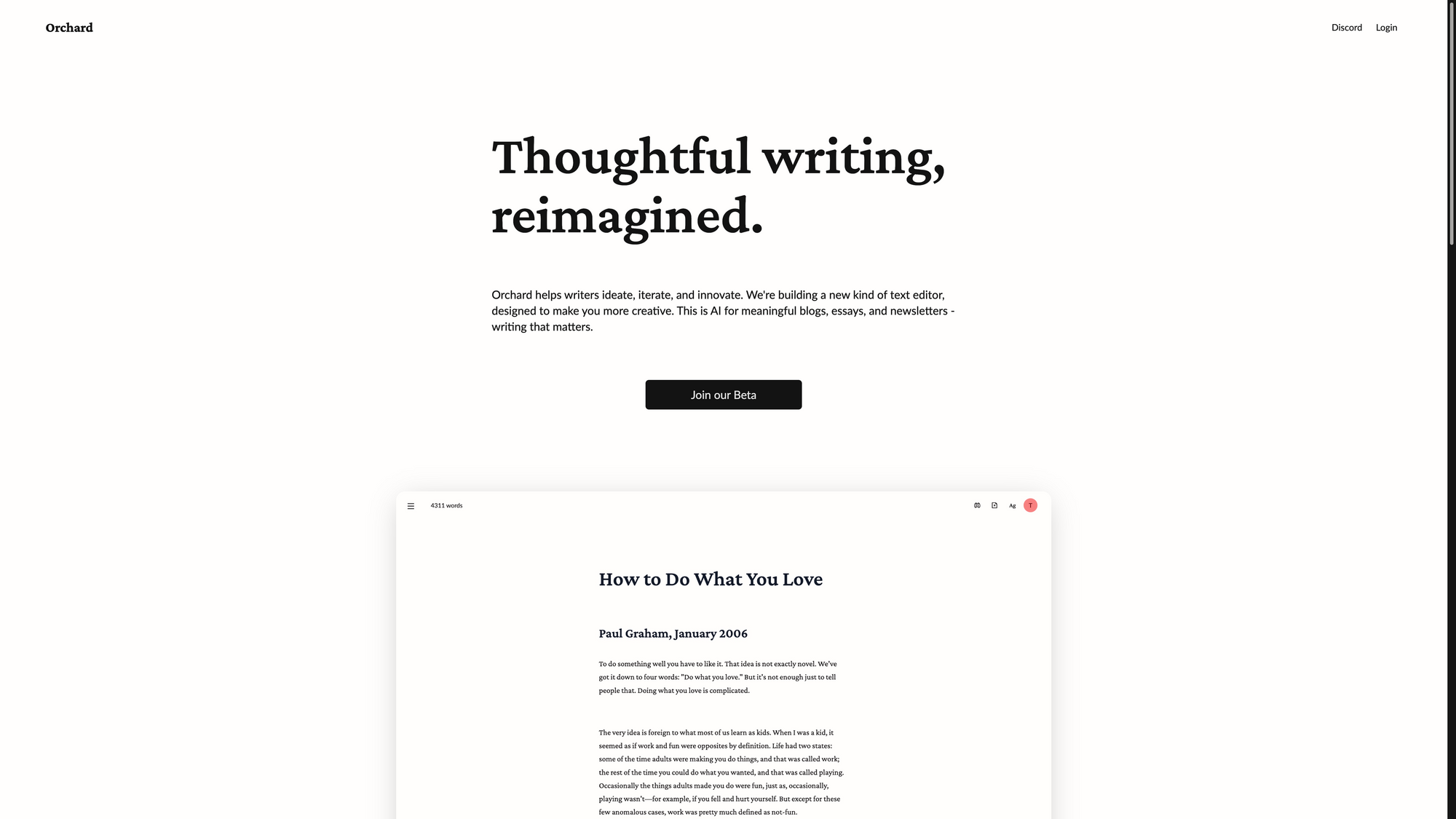 Orchard is building a new kind of text editor, designed to make you more creative. Orchard is powered by AI and helps you to create meaningful blogs, essays, and newsletters. While writing, it can always happen that you are hitting a wall, you are experiencing writer's block. While sometimes it definitely helps to get up, do something different, and get back to your writing at a later point, it can also happen that you are simply stuck. This means, not knowing how to continue your blog post, or not having the feeling that your writing is not concise enough to deliver the ideas, feelings, and thoughts you had in mind while writing it. Orchard is delivering a new perspective on editing. If you ever have the feeling that the paragraph you have just written is not concise enough, just ask Orchard to make it more concise, or see what a debater might say about your persuasive essay.