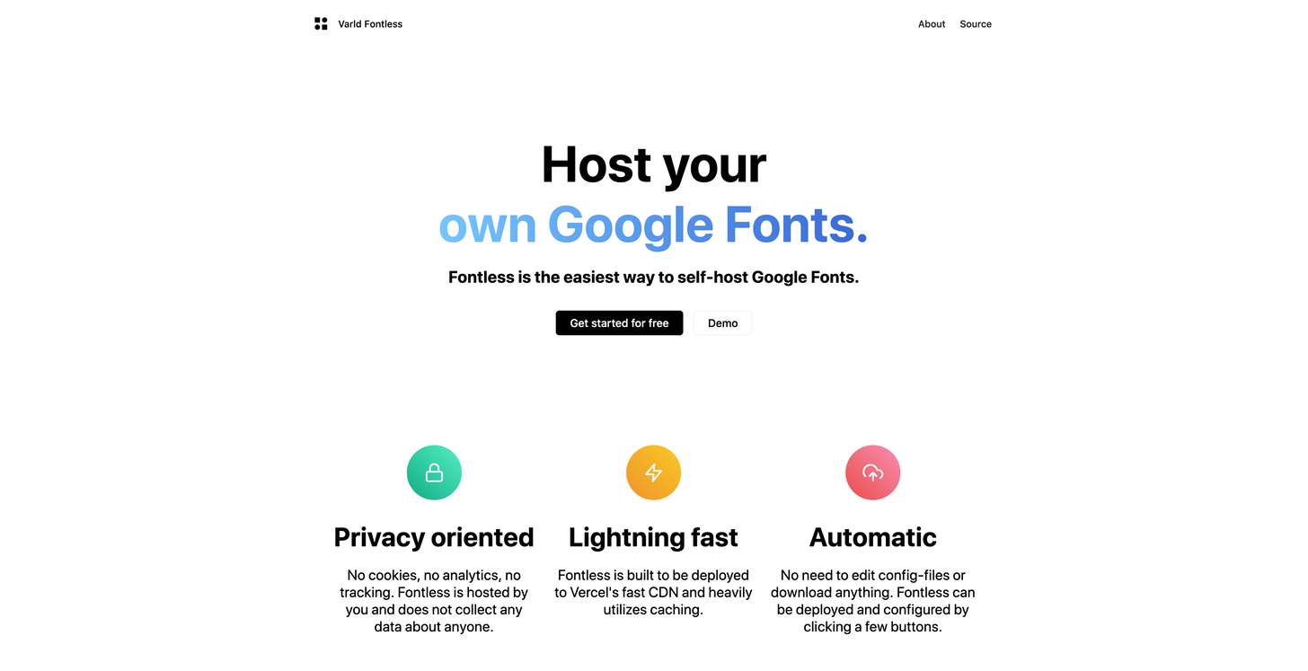 Every now and then I come across tools and get super excited about them because they solve a problem I did not know that it exists. One of those tools is Fontless by Varld, a small product studio based in Austria. So, what is Fontless? Fontless lets you host your own Google Fonts. You might think now "Why should I host my Google Fonts on my own when they are already hosted by Google and can be implemented on any website with just one line of code?". Well, hosting Google Fonts on your own gives you some powerful advantages. The first one, and that is already the most important one when you host your own Google Fonts your website gets more privacy-oriented since Google has no chance to collect any data, no cookies, no analytics, no tracking. Fontless is built to be deployed to Vercel's fast CDN and heavily utilizes caching. So, you can be sure that your website and your fonts will load super fast. Fontless also saves you a lot of time. No need to edit config-files or download anything. Fontless can be deployed and configured by clicking a few buttons. I really love the approach of Fontless, and I am super glad I found out about this tool. H/t Nic from The Slice, for introducing me to Fontless.