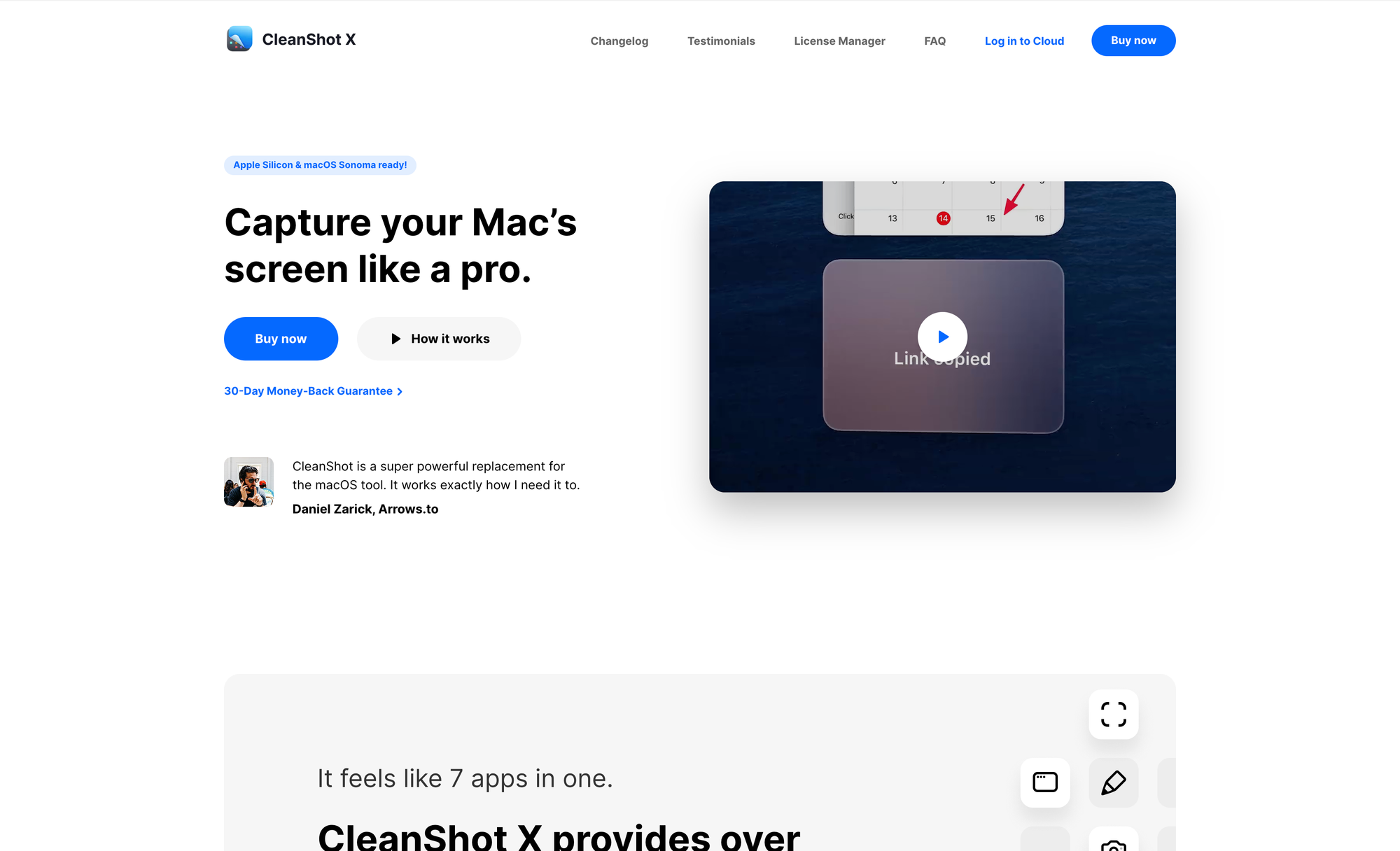 CleanShot is the fastest and easiest way to capture your Mac's screen, like a pro. Once you created a screenshot with CleanShot, a quick access overlay will appear at the corner of your screen. From that quick access overlay, you get the options to instantly save, copy, or drag and drop screenshots or screen recording to other apps. Besides that, CleanShot offers a variety of features to highlight and annotate important parts of your screenshot. With the scrolling capture feature, you can capture a complete webpage, a large chunk of code, or a chat history with ease. CleanShot is not only limited to capture screenshots, since in just a few clicks, you can use it to record your screen and save it as a video or an optimized GIF file. You can choose whether to show your webcam in recordings, record your microphone and macOS audio, highlight mouseclicks and keystrokes, and you can also automatically hide notifications.