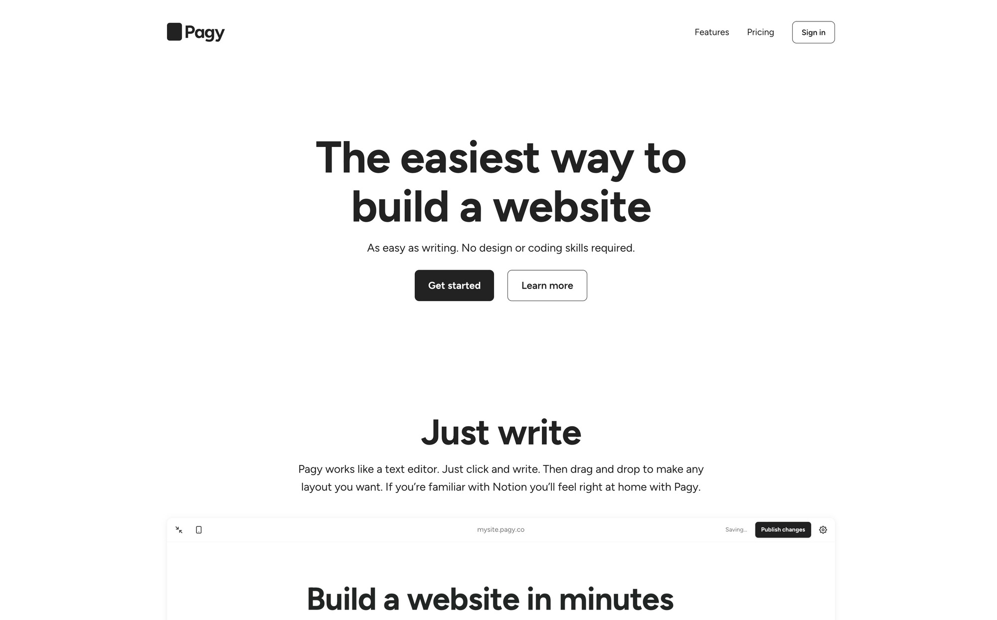 But what does it mean if a website builder states it is working like a text editor? Well, it means that you just click and write. If you are familiar with apps and text editors like the one in Notion, giving you access to multiple blocks and layouts just from a slash command, you feel right at home with Pagy. Within Pagy just press Slash and select any kind of block. After that you can drag and drop those blocks and create the layout you want. Since Pagy offers a selection of pre-built sections it is even easier to get started. Once you have chosen from those pre-built sections you can mix and match them to your likings.