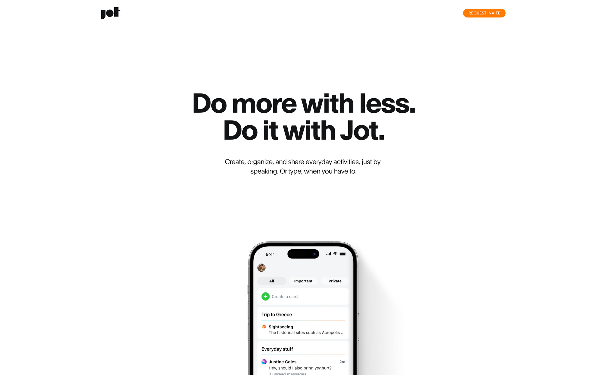 What makes this possible is Jotâs unique state-of-the-art voice recognition. Most of the time, talking instead of typing is way faster, especially when you are on your phone. Jot gives you possibility to create, share, and chat effortlessly knowing your privacy and content are protected. All the content you create within Jot will get neatly organized with cards. No matter if you need to jot down a note for a new project or your list for your next travel plans, everything you capture within Jot gets captured in a card. Those content cards are simple to create, and easy to share. In addition to cards, Jot lets you create lists to quickly jot down things you need to accomplish. With Jot you can use a single app to quickly capture your notes and thoughts, but at the same time collect the groceries you need, keep tabs on your daily chores, or make sure you do not forget anything for your next trip. And the powerful thing is, you just need to tell Jot what you need to do next, and it will help you remember it.