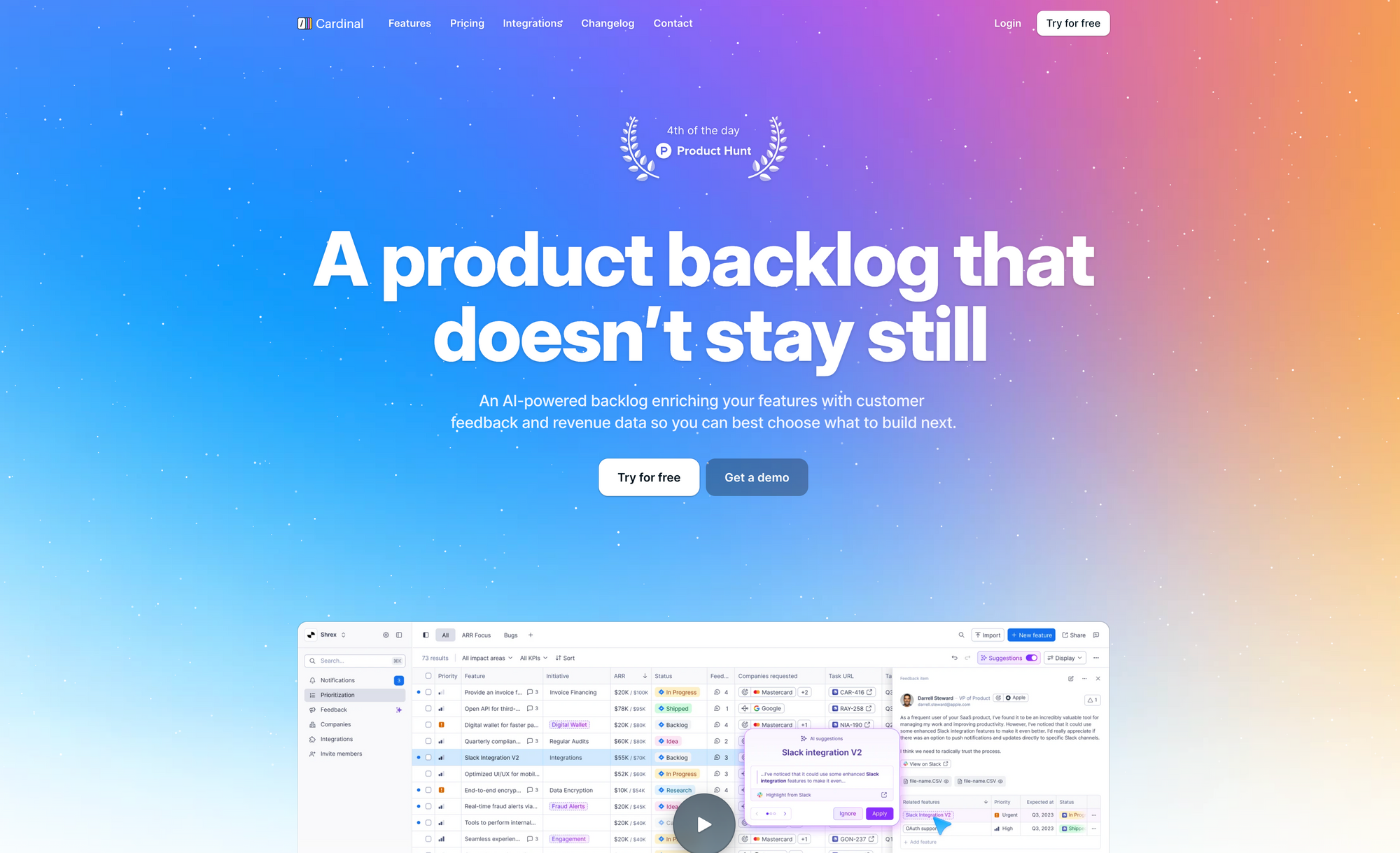 Product Management is hard. Knowing your customers is hard. Prioritizing what you want build and what your customers are requesting is hard. Cardinal is an app offering an AI-powered backlog enriching your features with customer feedback and revenue data so you can choose what to build next.