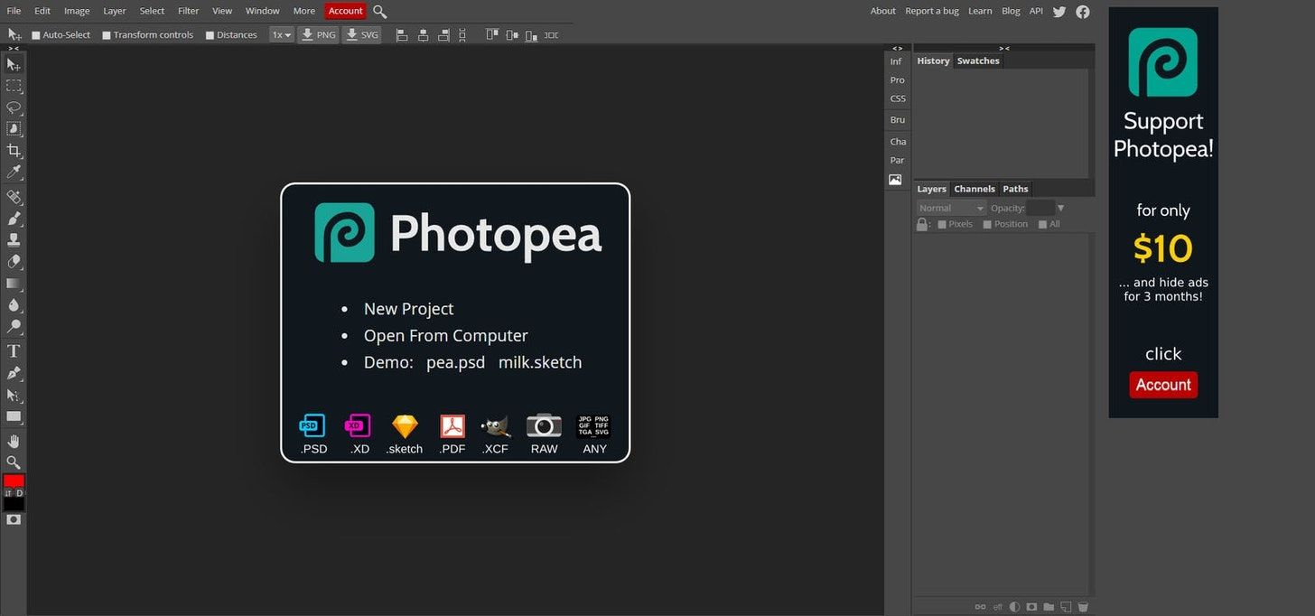 Photopea is an amazing, online image editor, whether you need to design a simple graphic or perform basic retouches to a picture, to advanced filters and scripting programming, Photopea has got you covered.
