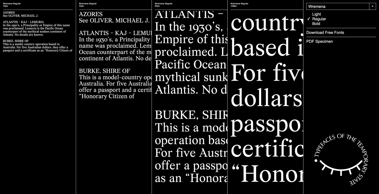Wremena is a serif typeface designed by Roman Gornitsky and published through Russian foundry The Temporary State in 2017. The design is an update on Gornitsky’s 2009 typeface Vremena, and, like its predecessor, is available as a free font. The design is similar to Times New Roman but features sharp, triangular serifs that become more pronounced in the heavier weights. The family is available in light, regular and bold styles but does not include italics.