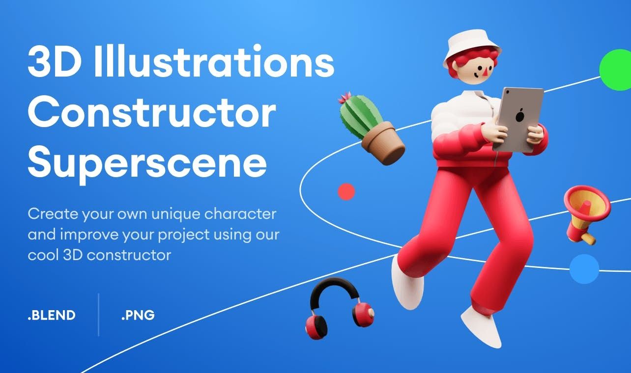 3D illustration constructor with funny characters inside. Create your unique illustrations or just take ready-to-use scenes from the pack. Compatible with Blender, Figma & Sketch.