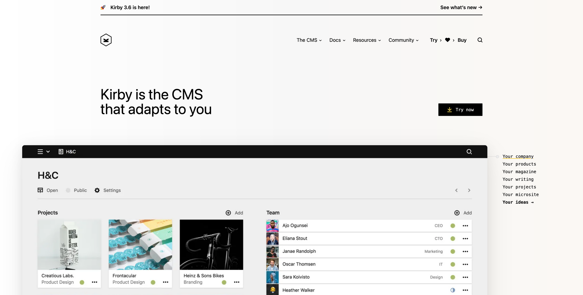Kirby is fully capable of building a personal website, a portfolio, a blog, a publication, a shop, you name it, just let your creativity flow. If you want to try out Kirby, you can simply check out a demo of it, which lets you explore the panel and you can get familiar with Kirby through six example projects. You can install Kirby on your computer or on a test server and evaluate as long as you need.