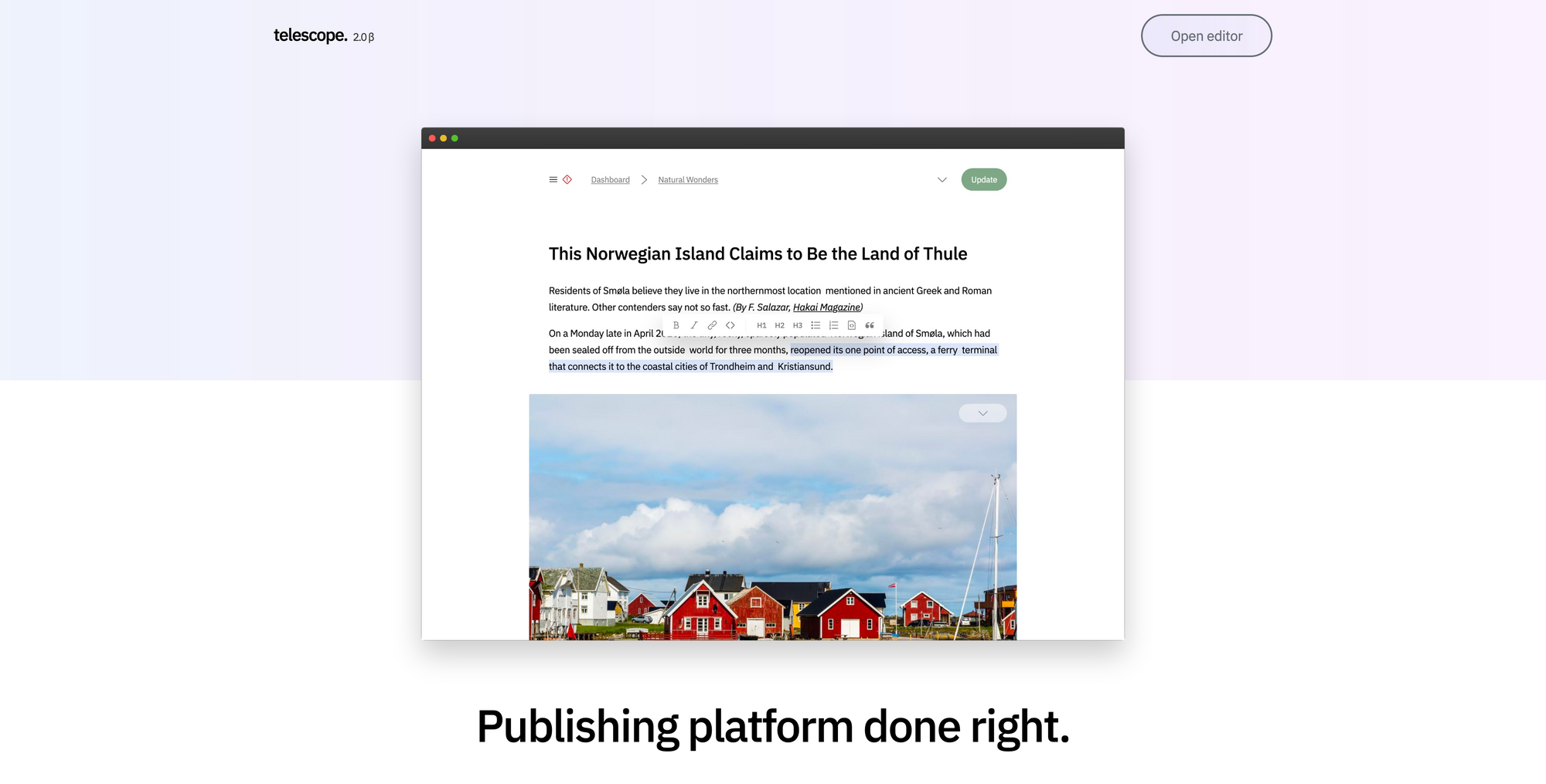 Telescope is a fast, minimal, simple, privacy-focused publishing platform. Think of it like Medium, but without all the bloat and bullshit. Telescope features a powerful and easy editor, which gives you the ability to fully customise links and tags, changing layouts, and include different types of content.