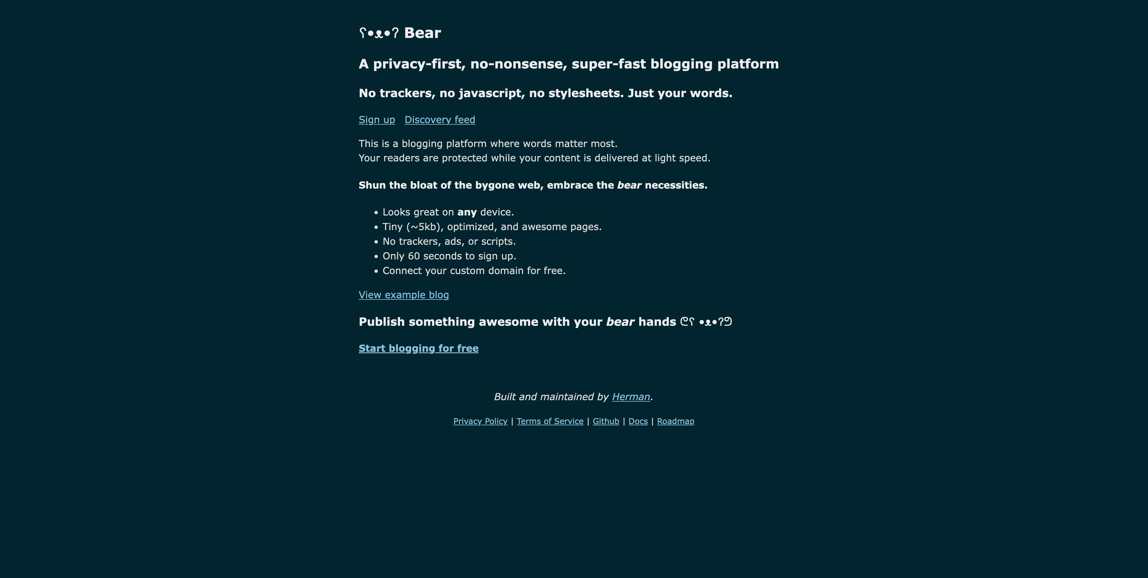 The only thing that matters while using Bear are your words. The platform is free of trackers, no javascript, no stylesheets, just your words. Bear is a truly lightweight and minimal blogging platform, that got rid of all the bloat. When you build your blog with Bear you can be sure that it looks awesome on every single device.