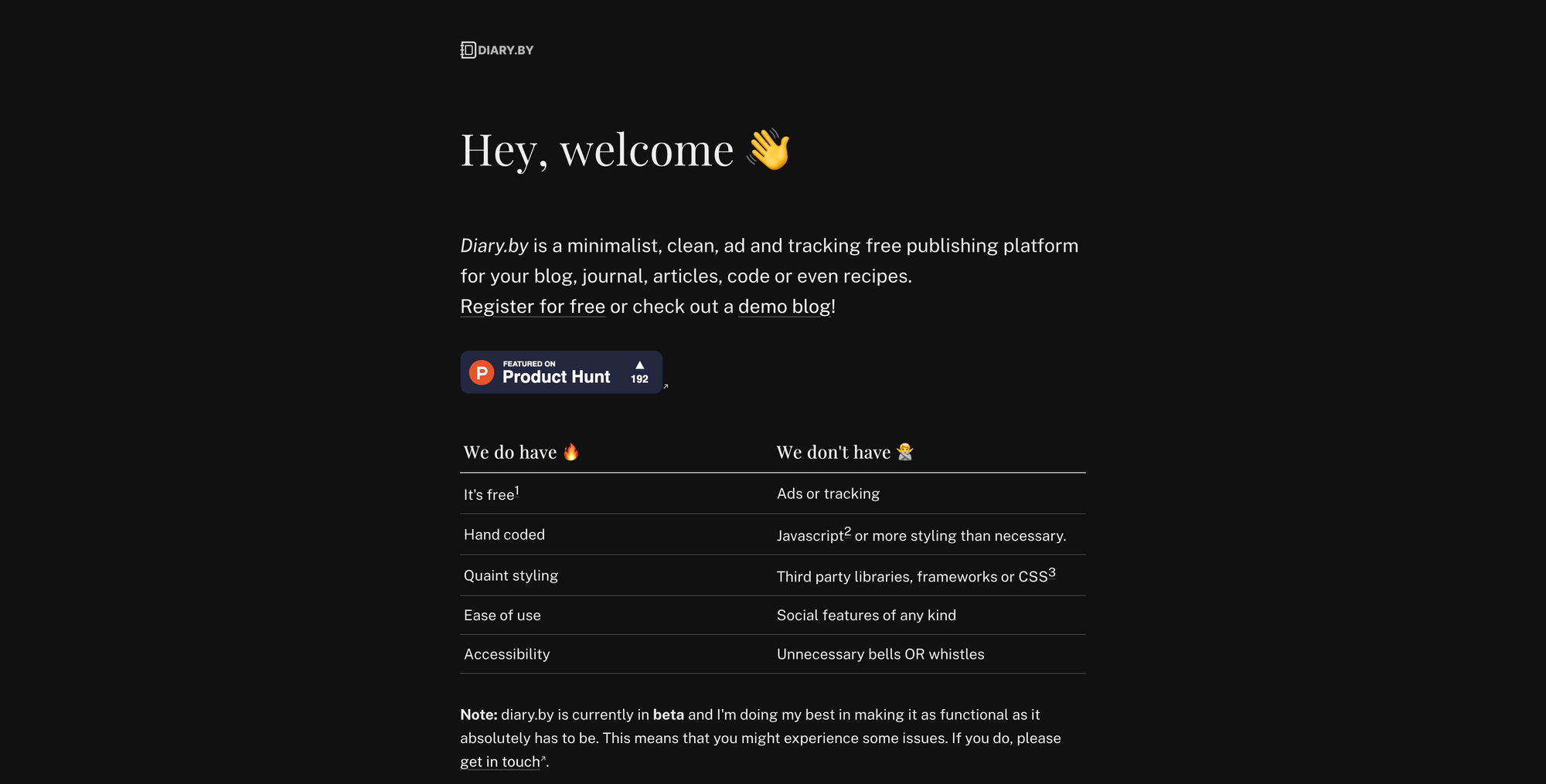 Diary.by is a minimalist, clean, ad and tracking free publishing platform for your blog, journal, or articles. Diary.by is currently still in beta, which means that you might run into some issues while using the service, but make sure to report these and provide valuable feedback to the maker. You can use diary.by completely for free to create and set up a blog.