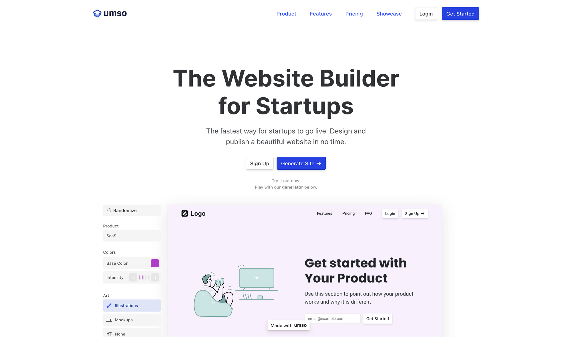 Umso is a website builder especially aimed at startups that want to go live and share their product or idea within a blink of an eye. Umso is capable of giving you an awesome experience while designing and building your next website and publishing it straightaway. What makes Umso really unique is its way of generating websites. When you start using Umso you will get prompted to answer some questions about your product, including your needs and use cases. No matter if you are building a mobile app or a SaaS product, Umso uses this information given by you to feed their editor.