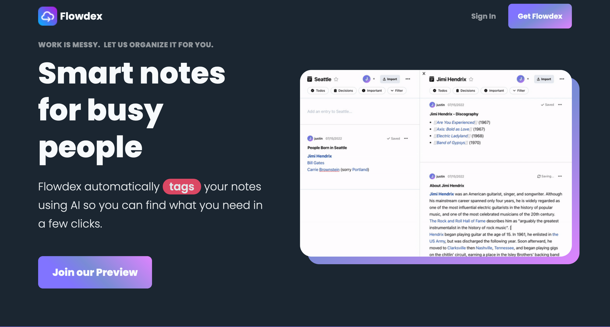Flowdex is suited for both, personal and professional projects. No matter if you want to take meeting notes, journal entries, recipes, academic research or anything else, Flowdex is a great place for all your thoughts no matter what you want to capture, the most important thing overall is to actually capture them. With Flowdex you can also keep your whole team in the know. Create a wiki for your team, use Flowdex, and you never have to worry about where to put stuff, but you will always know where things are stored when you need them. Thanks to the power of AI. At the core, Flowdex is built around the idea of flows, and a flow is a stream of notes, about one topic. For example you can set up a flow for a recurring meeting, and within this flow you can then jot down notes and thoughts regarding each meeting about a specific topic. Within a flow you can also jot down tasks, or mark dedicated bits with an important tag. Once you finished taking your notes and jotting down your to-dos, Flowdex lets you highlight specific content of your notes. For example, you can only highlight the task you have jotted down within a flow, or only highlight the bits you marked as important. This is incredible helpful, since you do not have to search through all of your notes and instead use the smart views within your flows in Flowdex.