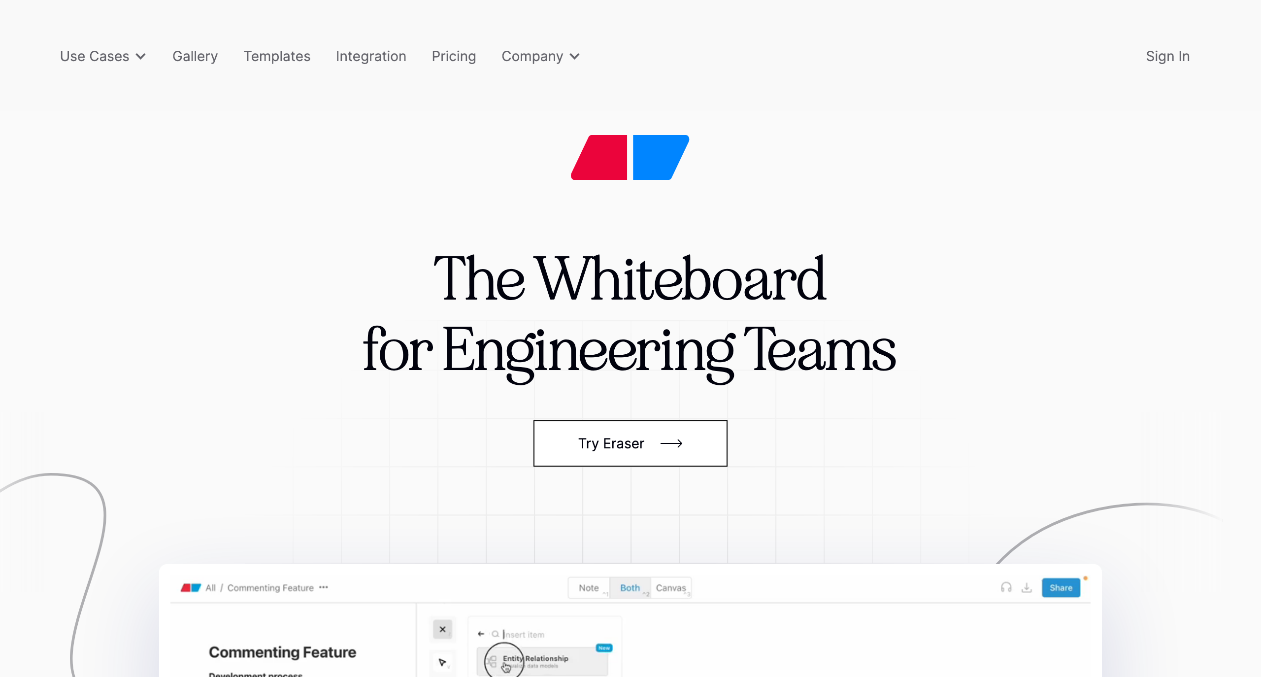 Eraser is built by engineers for engineers, which means you will find powerful features like diagram-as-code, code blocks on canvas, and markdown compatibility. The biggest advantage of Eraser is the fact that you are able to create visual documents. There is no doubt, that visual documents make it easy to brainstorm and communicate clearly. Within Eraser you can write documents as you used to do, but at the same time you can add visual elements on a whiteboard, to add more context to your documents. Create beautiful diagrams with ease, and link to them within your documents to organise your teamâs knowledge base within one beautiful space.