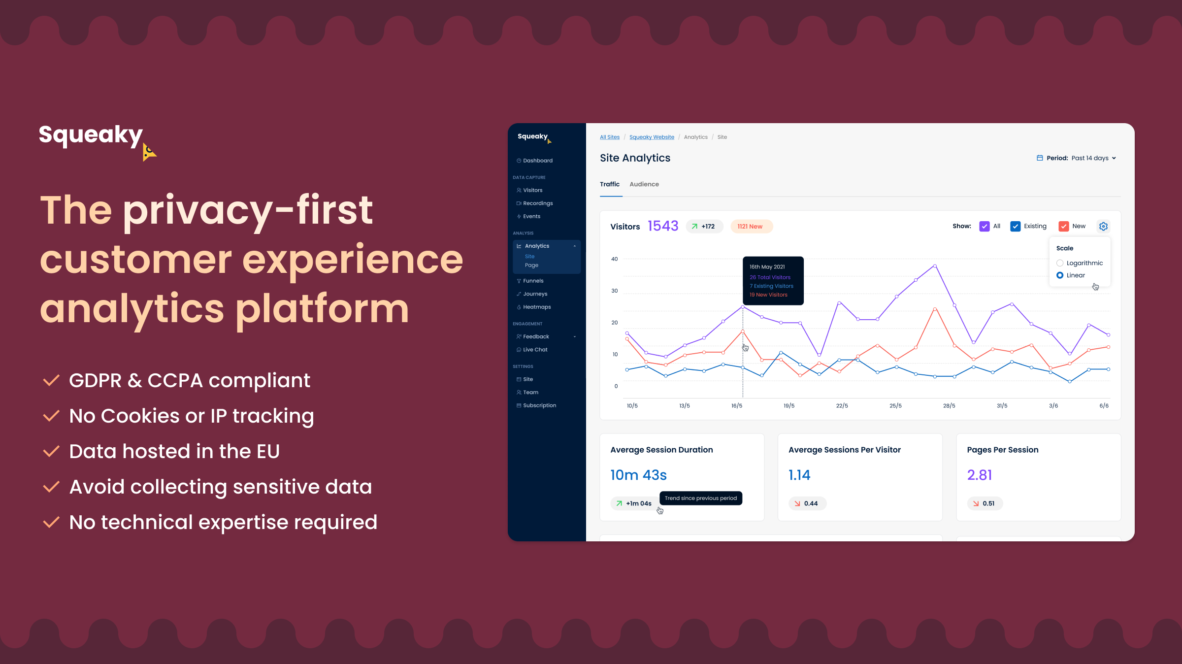 If youâre looking for a privacy-friendly and future-proof alternative to Google Analytics or Hotjar then try Squeaky. It's easy to get started, and their amazing analytics suite includes site analytics, events tracking, session recording, feedback widgets, heatmaps, user journey mapping, and more.