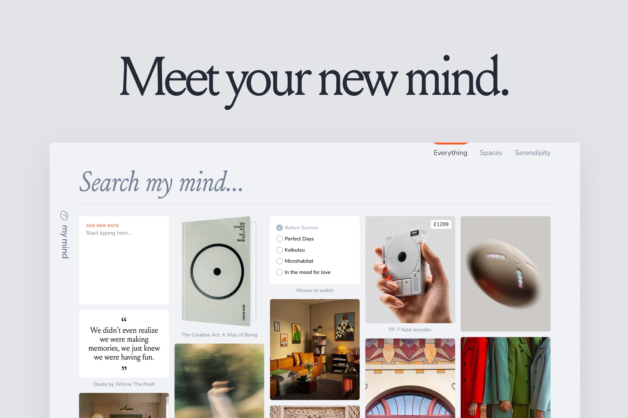 Unlike traditional bookmarks, no link looks the same in mymind. Everything is visualized in the most beautiful way possible – books look like books, quotes look like quotes. It’s built with creative people in mind, with a highly visual interface, instant moodboards and color support. It’s your personal treasure trove of inspiration and information.