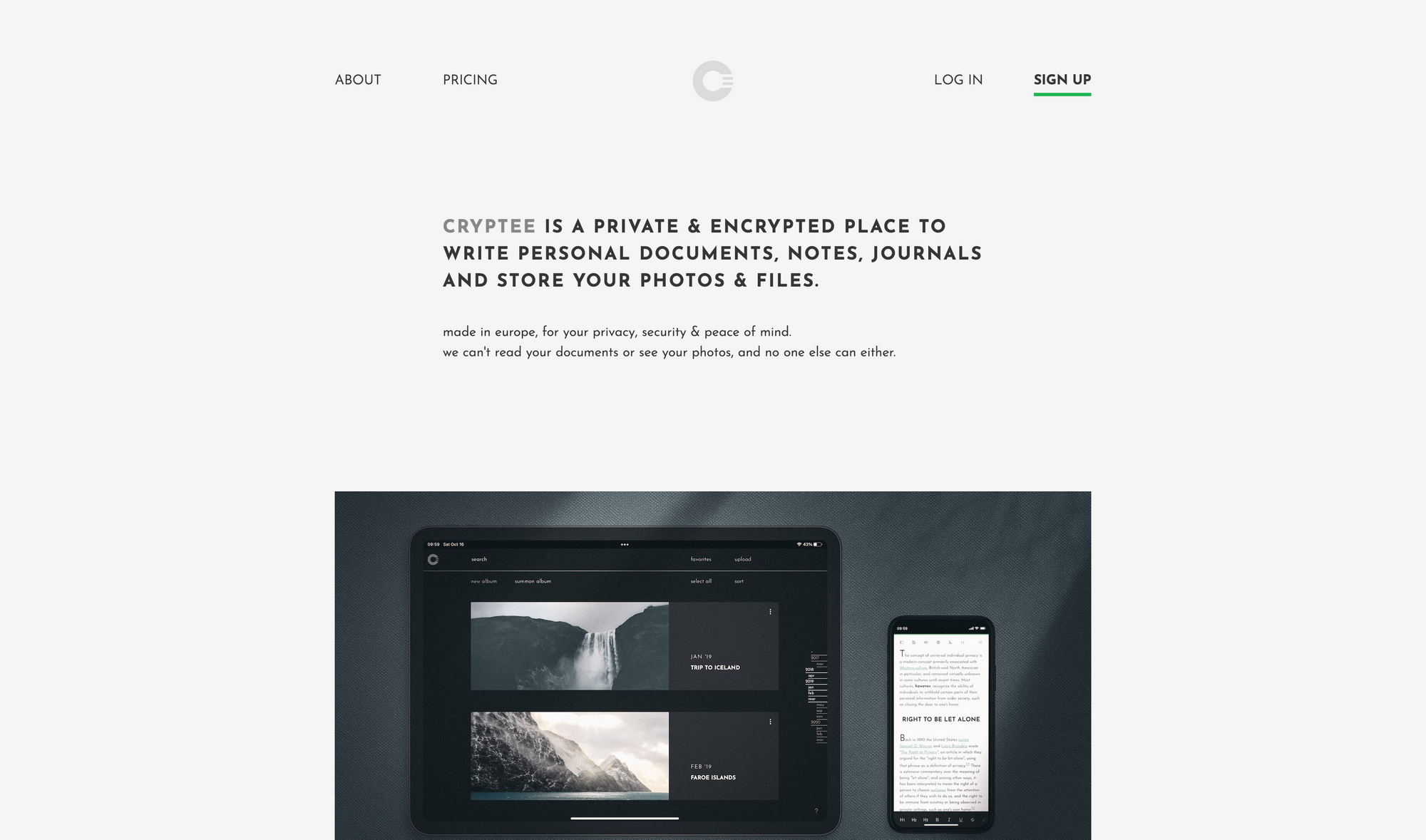 Cryptee is an exciting new tool made in Europe, with privacy and security as its core elements. Cryptee is an encrypted place that lets you write personal documents, notes, journals, but also store and save your photos and files. It is one of the very first tools that I came across that is combining note-taking, documents, journaling with file and photo-storing. Crypteeâs encrypted document editor gives you the possibility to write private and personal documents in a beautiful writing interface. All your documents are encrypted before they leave your device. Which means no one can ever read your documents besides you.