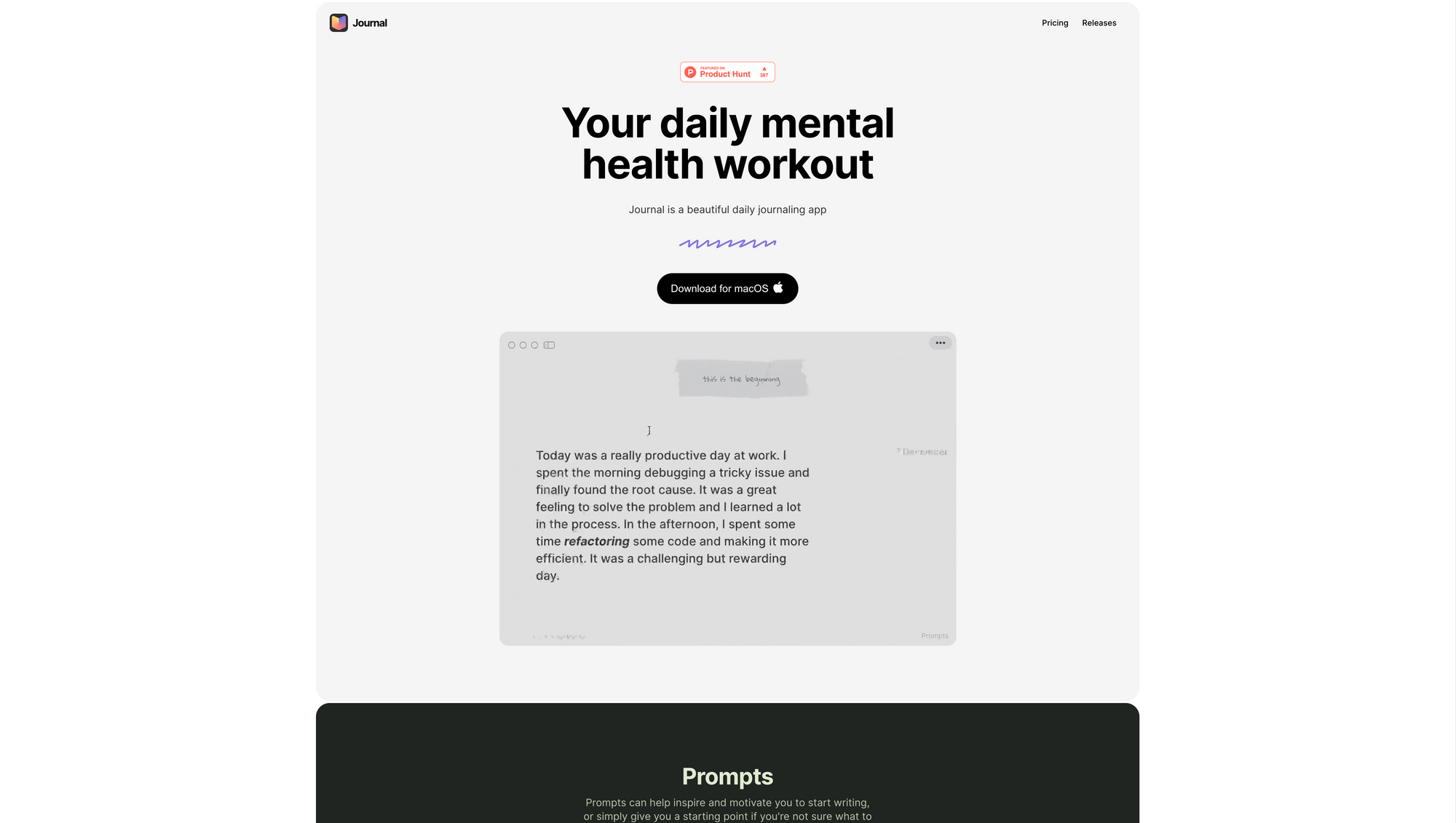 Journal is a beautiful app for your daily mental health workout. It is available for macOS and you can use it for free for up to 30 entries. The Writer Plan will cost you $48 per year or $5 per month and gives you access to unlimited entries.