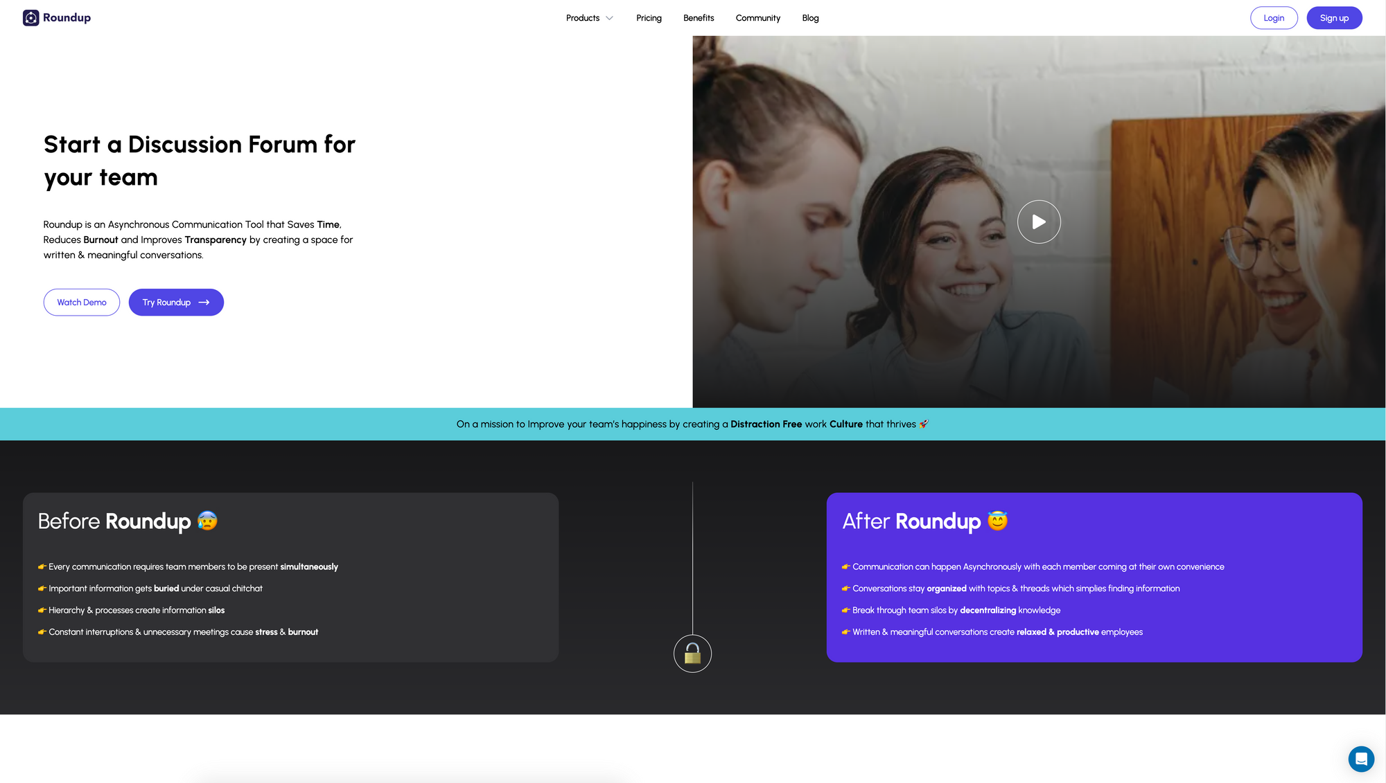 Since I recently started to work remotely 100%, I got back to looking into some remote and asynchronous working processes and resources. While doing so, I stumbled across Roundup, a tool that lets you create a discussion forum for your remote team. Roundup is an asynchronous communication tool, that claims to help you save time, reduce burnout, and improve transparency by creating a space for written and meaningful conversation.
