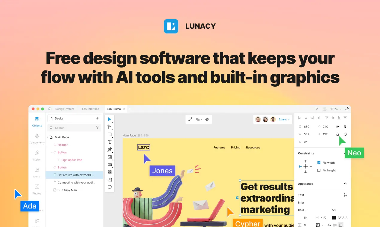 Designers probably know the struggles regarding removing backgrounds from certain images. The more detailed the image is, the harder it gets to release any kind of objects from that image. Lunacy has an AI-powered background removal tool already built into their software to make it as easy and as streamlined as possible to remove any background from your images to make them transparent. Another AI-powered tool built into Lunacy is their avatar generator, which lets you create avatars for designs including contact lists, testimonials, team sections, and more. Last but not least, generating text within Lunacy is also powered by AI. Say goodbye to boring lorem ipsum, and present your interfaces with placeholder text. Beside its powerful AI tools, Lunacy also offers an in-built library of free icons, illustrations, and photos.