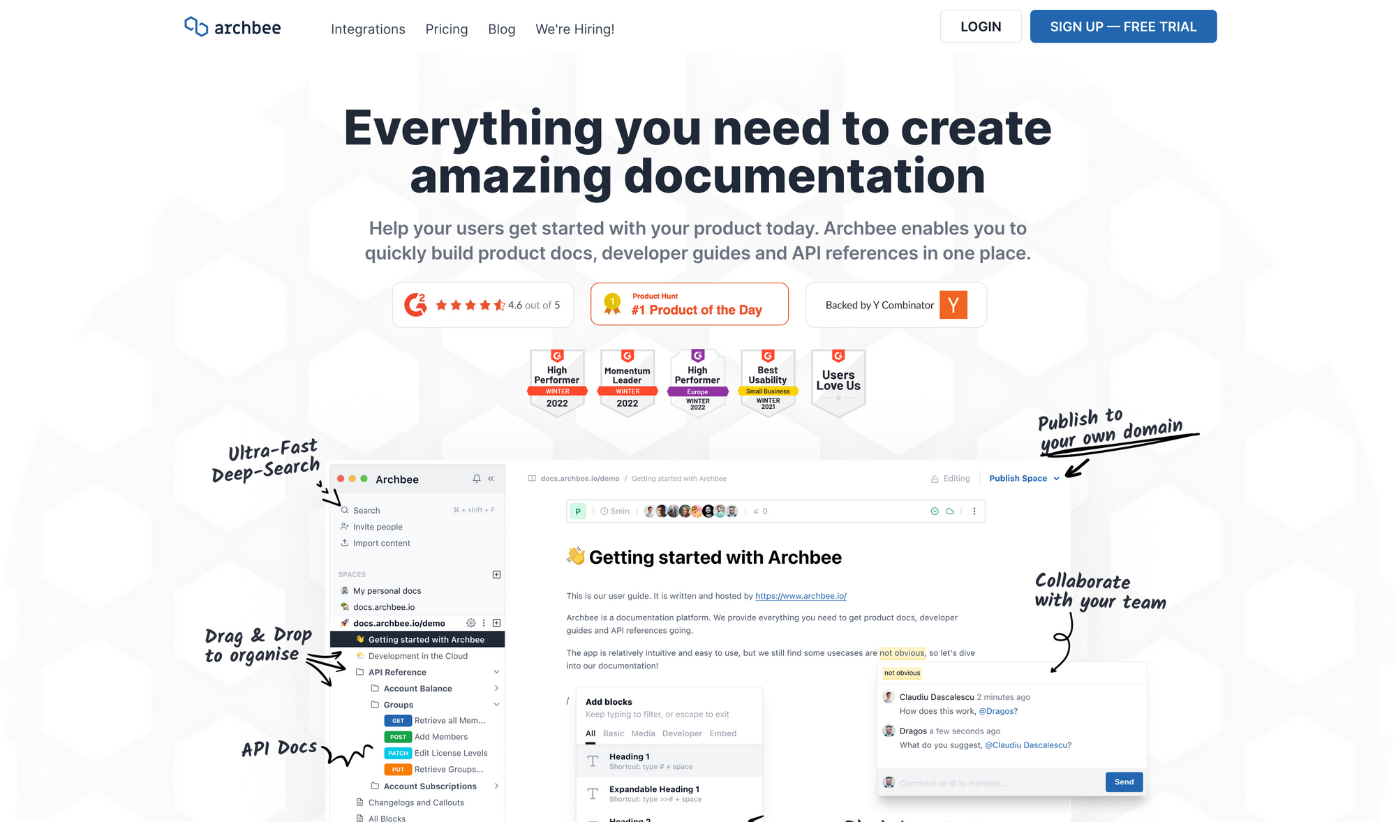 Building a product always (or at least it should) involves setting up some sort of documentation to get your users started. Archbee is a dedicated tool to set up and quickly build product docs, developer guides, and API references all in one place. If you ever had the feeling that you spend too much time on crafting documentations for your products, Archbee helps you saying goodbye to that.