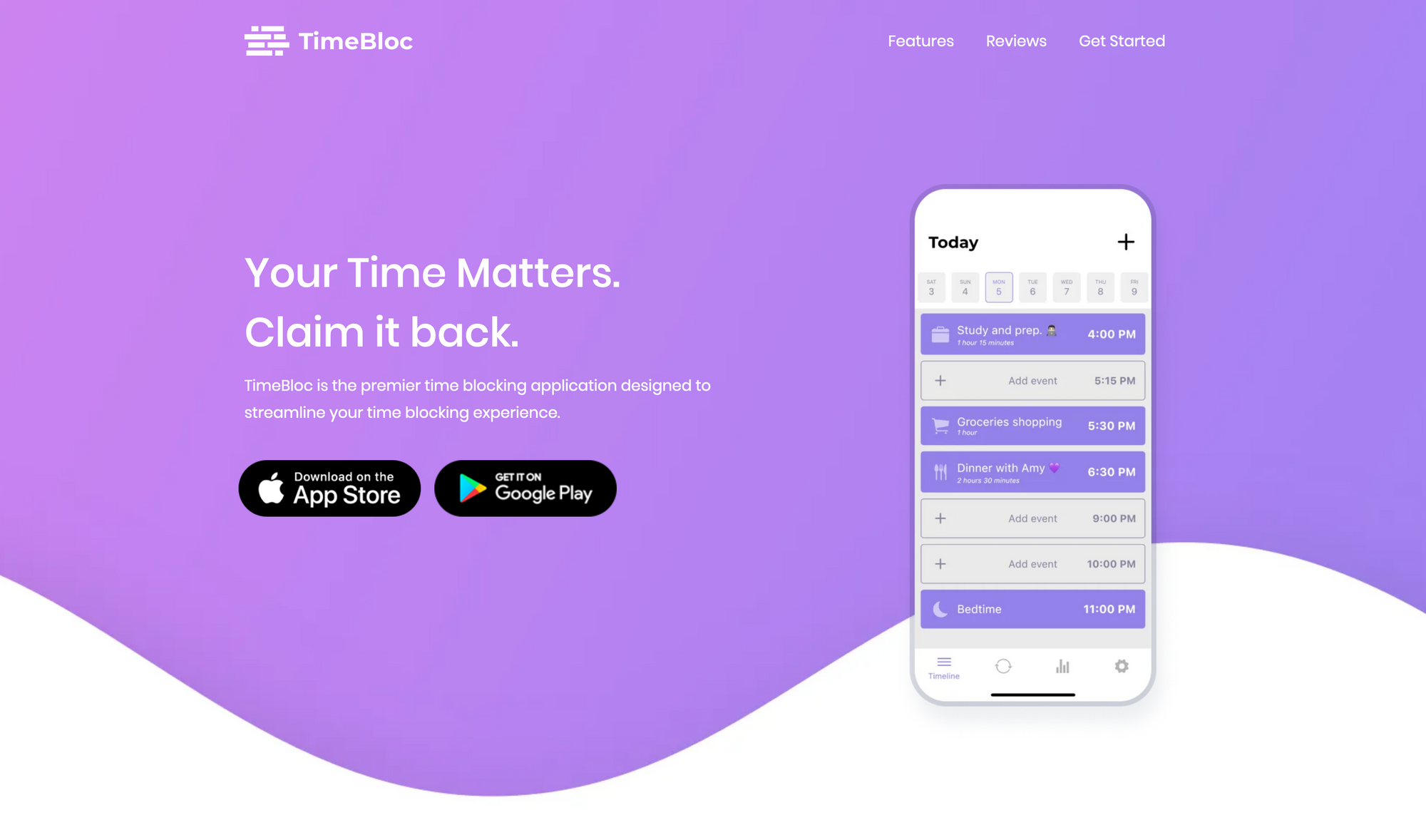 Performing this every single day, will make it easy and simple to establish routines. Creating and acting on those routines in TimeBloc works like a charm, just plan your daily routines once and let TimeBloc integrate them into your timeline. You can use those daily routines for example to block out time for your breakfast or lunch, workout sessions, mediation, and more. Once you have planned your day with TimeBloc, all your events and tasks will be displayed within one beautiful timeline. With this daily view, you can easily switch between your upcoming days and also get a glimpse of what you have done and achieved the days before.