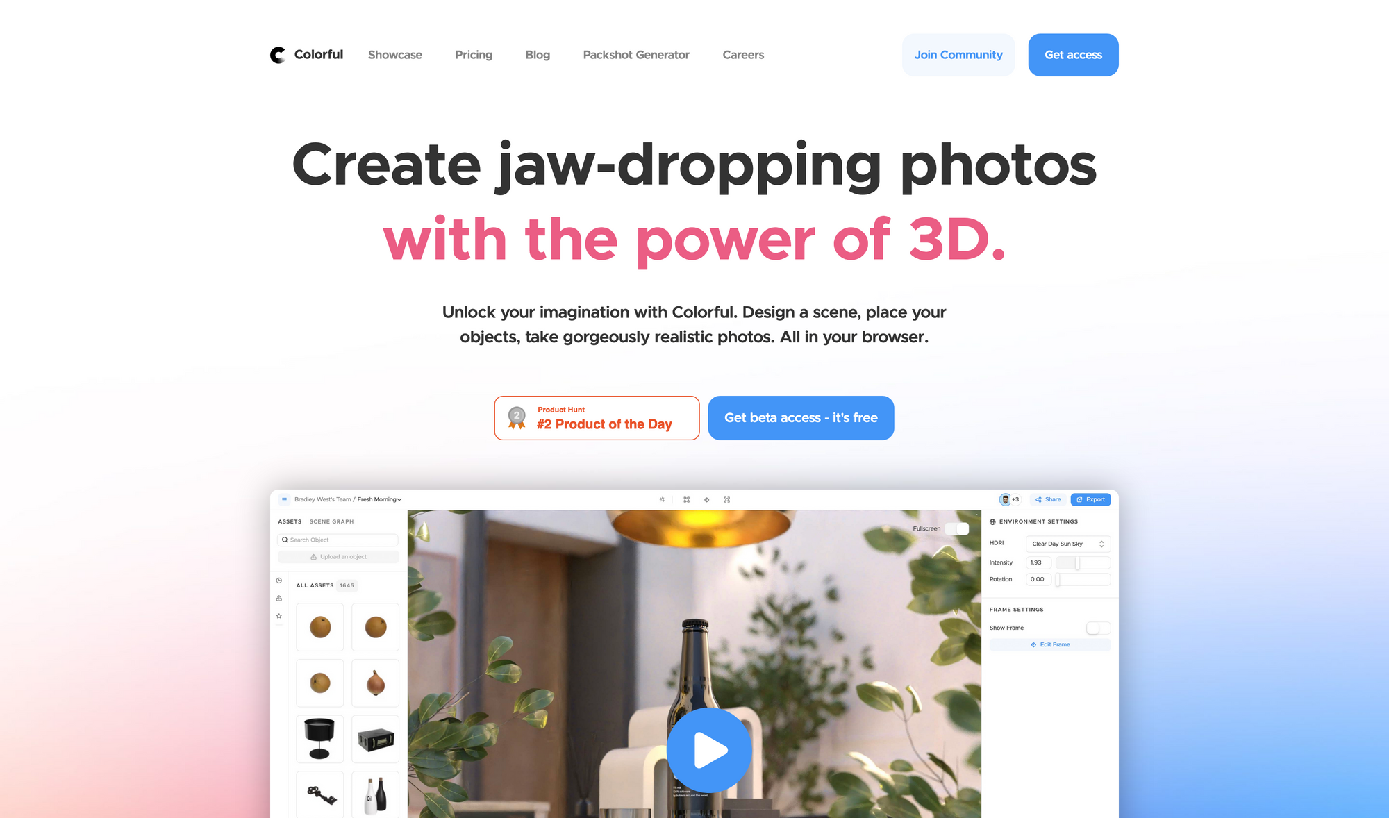 Within the creative field, 3D is one of the fastest growing areas right now, especially driven by the recent boom of NFTs, but also companies and makers of apps and tools are using 3D graphics within their marketing measures, illustrations, onboardings, and more. While all creative skills have a certain kind of learning curve to it, there are more and more tools which let everyone, designer or not, unlock their creative potential. Colorful is a dedicated tool to create and design a scene, place your objects, and take gorgeously realistic photos, all within your browser.